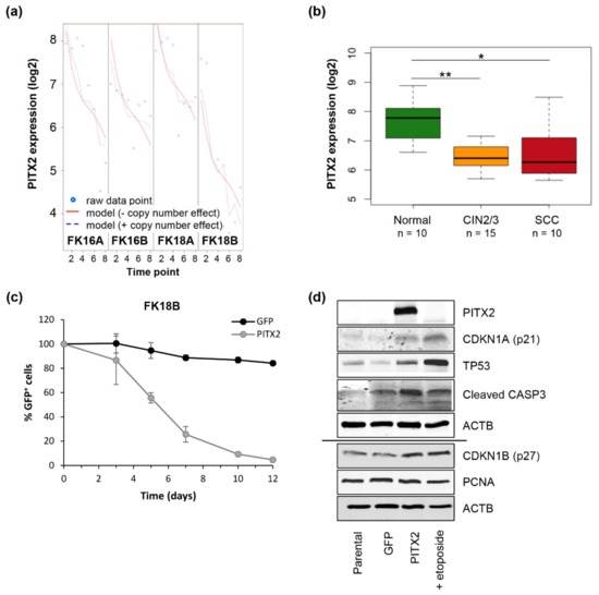 PITX2 acts as tumor suppressor in HPV-induced transformation. (a) PITX2 expression in HPV-transformed keratinocyte cell lines. Using our tigaR method, a model without (red continuous line) and with copy number effect (blue discontinuous line) was fitted [17]. Similarity between the fitted models indicates that differential PITX2 expression is not copy number-driven. (b) PITX2 expression in mRNA microarray data obtained from normal HPV-positive cervical epithelium (Normal), high-grade precancerous lesions (CIN2/3), and squamous cell carcinomas (SCC). Boxplots show medians with lower and upper quartiles, and range whiskers. * p < 0.05, ** p < 0.005, according to the Wilcoxon rank-sum test. (c,d) Late FK18B cells (ca. passage 190) were transduced with an empty LeGO-iG2 vector or a LeGO-iG2-PITX2 construct. (c) FACS analysis: Mean and standard deviation of two independent experiments are shown. (d) Western blot analysis. Cells were harvested 72 h after transduction. Cells treated with etoposide were included as positive control for TP53/CDKN1A signaling.