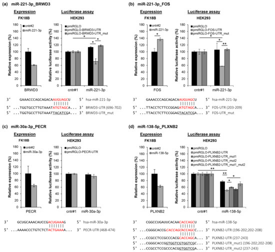 Confirmation of miRNA-mRNA interactions. Predicted miRNA-mRNA interactions (a) miR-221-3p_BRWD3, (b) miR-221-3p_FOS, (c) miR-30a-3p_PECR, and (d) miR-138-5p_PLXNB2 were investigated using mRNA expression analysis and dual-luciferase reporter assays. Left panel: Effects of ectopic expression of the miRNA on the expression level of its predicted mRNA target. Expression levels were determined by qRT-PCR in late passage FK18B cells (ca. passage 190) transfected either with a negative control (cntr#2) or with the respective miRNA mimic. Data was normalized to SNRPA. Mean and standard deviation of two technical replicates are shown. Right panel: Dual-luciferase reporter assay to confirm direct interaction between the miRNA and its predicted target mRNA. HEK293 cells were transiently transfected with a negative control (cntr#1) or the respective miRNA mimic in combination with either an empty pmiRGLO vector, a pmiRGLO construct containing the predicted binding site (pmiRGLO-predicted target-UTR), or a pmiRGLO construct containing a mutated binding site (pmiRGLO-predicted target-UTR_mut). MiRNA, UTR, and binding sites are indicated in the lower panel. Mean and standard deviation of three technical replicates are shown. * p < 0.05, ** p < 0.005., according to the two-sided Student’s t-test.