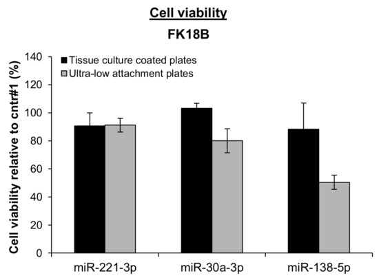 Effect of miRNAs on adherent and anchorage-independent growth of late passage FK18B cells. Cell viability of late passage FK18B cells upon ectopic expression of miR-221-3p, miR-30a-3p, and miR-138-5p was measured in adherent tissue culture coated plates and ultra-low attachment plates and standardized against miRNA mimic negative control #1. Mean and standard errors of three independent experiments are shown.