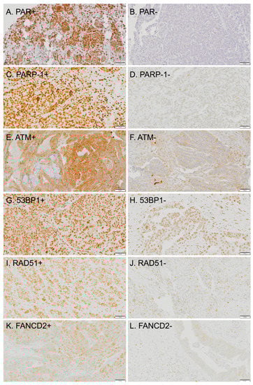 - Cruz, C.; Castroviejo-Bermejo, M.; Gutierrez-Enriquez, S.; Llop-Guevara, A.; Ibrahim, Y.H.; Gris-Oliver, A.; Bonache, S.; Morancho, B.; Bruna, A.; Rueda, O.M.; et al. Rad51 foci as a functional biomarker of homologous recombination repair and parp inhibitor resistance in germline brca-mutated breast cancer. Ann. Oncol. 2018, 29, 1203–1210. [Google Scholar] [CrossRef] [PubMed]
