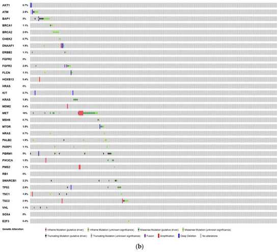 We analyzed next-generation sequencing data from the Cancer Genome Atlas (TCGA) in an effort to elucidate the genomic landscape of these tumors (Figure 2). The figures were generated to show copy number alterations and mutations in selected genes. The figure panel was created using the cBioPortal [81] for the kidney (papillary [n = 274], clear cell [n = 354]), bladder urothelial (n = 406), prostate adenocarcinoma (n = 489), and testicular cancer (n = 144) data sets available on the portal. Patients with prostate adenocarcinoma had a higher frequency of mutations in genes related to DNA repair: BRCA2 (5%), CHEK2 (1.6%), ATM (6%), as well as mutations in cell cycle regulating genes: RB1 (10%) and TP53 (16%). The papillary RCC dataset showed high mutation rates in the MET gene (10%), which is targeted with MET inhibitors like cabozantinib [82] as well as mutations in PBRM1 (5%) which can affect responses to immunotherapy [83]. The urothelial carcinoma dataset showed mutations in targetable genes such as FGFR3 (19%), ATM (14%), BRCA2 (13%), PIK3CA (25%), and ERBB2 (17%) which may provide insight into future therapeutic strategies. The most commonly found mutation in the TCGT sample was KRAS (17%) followed by KIT (15%), which are both targetable and may affect platinum chemosensitivity and disease progression.