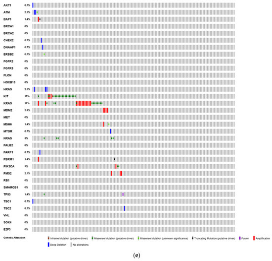 The Cancer Genome Atlas (TCGA) figure was generated to show copy number alterations, and mutations in selected genes. The figure panel was created using the cBioPortal [81] for the bladder, kidney (papillary and clear cell), bladder urothelial, and prostate data set available on the portal. Deep deletion denotes a deep copy number loss, potentially a homozygous deletion. Amplification denotes a high-level, often focal, copy number gain of multiple copies. Deep deletions and amplification are considered more biologically relevant than shallow deletions (which are often heterozygous) and low-level copy number gains. (a). clear cell renal cell carcinoma TCGA mutational landscape. (b). papillary renal cell carcinoma TCGA mutational landscape. (c). Bladder Urothelial Carcinoma TCGA mutational landscape. (d). Prostate adenocarcinoma TCGA mutational landscape. (e). Testicular cancer TCGA mutational landscape.