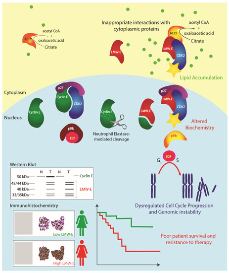Model: Low molecular weight cyclin E (LMW-E) isoforms are generated by neutrophil elastase-mediated proteolytic cleavage, removing the N-terminal nuclear localization signal. LMW-E isoforms accumulate in the cytoplasm where they inappropriately interact with cytoplasmic proteins, such as ACLY. The altered biochemistry of LMW-E results in hyperactivation of CDK2, resistance to endogenous CDK-inhibitors (p21CIP1 and p27KIP1) and altered substrate interactions, which results in enhanced cell cycle progression, genomic instability and other pro-tumorigenic features. Evaluation of LMW-E by Western blot (protein size) or immunohistochemistry (cytoplasmic localization) is prognostic of poor prognosis and predicts failure of standard treatment modalities.