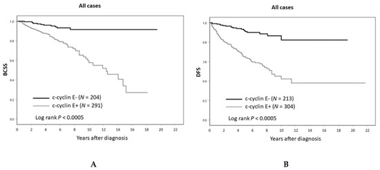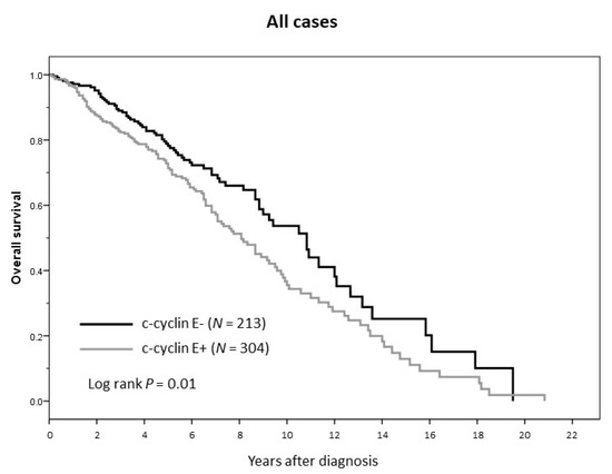 At ten years of follow-up, BCSS for patients with c-cyclin E-negative tumors was 92% versus 58% for those with c-cyclin E-positive tumors (HR = 6.23, 95% CI 1.92–20.14; p = 0.002 in multivariate analysis). At completion of follow-up, the absolute difference in median overall survival (OS) by c-cyclin E status (positive versus negative) was 33 months (130 versus 97 months, p = 0.01 by logrank, Mantel–Cox) (see Figure 6).