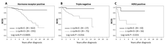 Kaplan–Meier plots of breast cancer-specific survival (BCSS) and disease-free survival (DFS) as a function of c-cyclin E status are shown in Figure 3. Lack of c-cyclin E was associated with good prognosis in the patient cohort (BCSS and DFS both p < 0.0005 by logrank test). This was observed for luminal A/B (ER+ and/or PR+), HER2+ and triple negative breast cancer subtypes (see Figure 4).