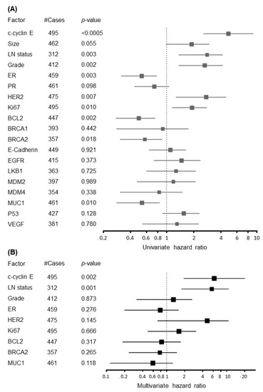 (A) Univariate and (B) multivariate analysis of c-cyclin E with clinicopathological and age-associated biomarkers.