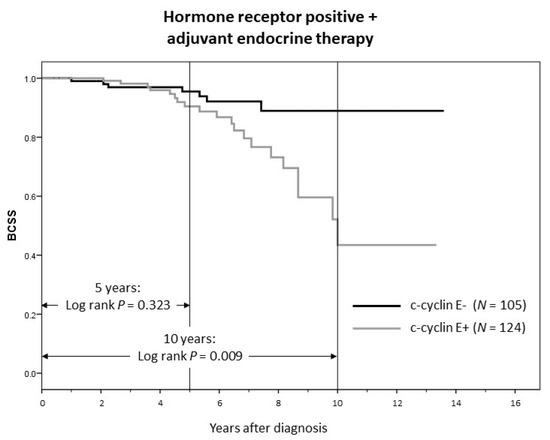 In contrast to the whole cohort (where c-cyclin E was the strongest predictor of 5-year BCSS), in patients who received up to 5 years of adjuvant endocrine therapy (n = 229), c-cyclin E was not associated with 5-year BCSS (p = 0.323). After cessation of adjuvant endocrine therapy, c-cyclin E reached prognostic significance (positive association with breast cancer-specific mortality) at 10 years of follow-up (p = 0.009) (see Figure 7).