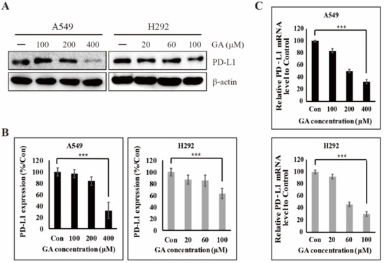 Gallic acid (GA) reduces the programmed death-ligand 1 (PD-L1) expression in non-small-cell lung cancer (NSCLC) cells. (A) The expression levels of PD-L1 protein in A549 and H292 cells were detected after GA treatment in concentrations indicated for 48 hours. (B) The relative expression levels of PD-L1 protein were determined by densitometry and normalized to β-actin. Data are representative of three independent experiments. *** p < 0.001 (t-test). (C) The expression levels of PD-L1 mRNA in A549 and H292 cells were detected after GA treatment in concentrations indicated for 48 hours. The relative expression levels of PD-L1 mRNA were determined by real time qPCR and normalized to GAPDH mRNA. Data are representative of three independent experiments. *** p < 0.001 (t-test).
