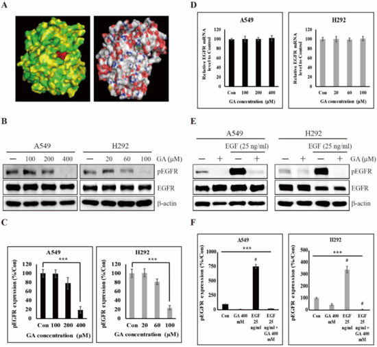 GA binding to epidermal growth factor receptor (EGFR) inhibits the phosphorylation of EGFR. (A) Binding of GA (PubChem CID: 370) to the ATP-binding domain of EGFR (Protein Data Bank ID: 4LQM) as determined by molecular docking using AutoDock Vina. (B) The expression levels of total EGFR and phosphorylated EGFR (pEGFR) protein in A549 and H292 cells were detected after GA treatment in concentrations indicated for 48 hours. (C) The relative levels of pEGFR protein were determined by densitometry and normalized to β-actin. Data are representative of three independent experiments. *** p < 0.001 (t-test). (D) The expression levels of EGFR mRNA in A549 and H292 cells were detected by real time PCR after GA treatment in concentrations indicated for 48 hours. The relative levels of EGFR mRNA were determined and normalized to GAPDH mRNA. Data are representative of three independent experiments. (E) A549 and H292 cells for detecting the expression levels of total EGFR and pEGFR protein were treated with or without 25 ng/mL EGF for 15 minutes and then further treated with GA (A549: 400 μM; H292: 100 μM) for 48 hours. (F) The relative levels of pEGFR protein were determined by densitometry and normalized to β-actin. Data are representative of three independent experiments. *** p < 0.001 (t-test). # p < 0.001 vs. control.
