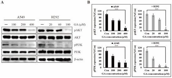 2.3. GA Reduces the Phosphorylation of PI3K/AKT That is One of the Downstream Targets of EGFR Signaling