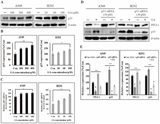 The tumor suppressor factor p53 plays an important role in cell-cycle arrest and apoptosis induction in response to oncogenic or other stresses for the prevention of cancer development. However, it is downregulated or mutated in an inactive form in almost all human cancer cells. A previous study found that p53 is led into Mdm2-mediated ubiquitination and degradation by PI3K/AKT signal transduction in breast cancer MCF-7 cells but not p53 mRNA [45]. Furthermore, p53-regulated IFN-γ induced PD-L1 expression in melanoma cells [32]. To investigate the effect on p53 by GA, we checked the protein levels of p53 with or without GA treatment in A549 and H292 cells and found that GA upregulates the expression levels of p53 protein in a concentration-dependent manner (Figure 4A,B). In addition, the expression levels of p53 protein were nearly doubled in A549 cells. Further, the mRNA levels of p53 identified by real time PCR showed a significant increase in a GA concentration-dependent manner in H292 cells as well as in A549 cells (Figure 4C). From these data, although a previous study revealed that PI3K/AKT signaling induced by their phosphorylation regulates only p53 protein levels, the PI3K/AKT signaling controlled by GA plays a key role in regulating both protein and mRNA levels of p53. These results additional imply that GA regulates p53 from mRNA levels through the downregulation of PI3K/AKT phosphorylation. To further understand the role of p53 in PD-L1 regulation, we used GA with or without p53 siRNA and determined whether specific gene silencing influences PD-L1 expression in A549 and H292 cells. As shown in Figure 4D,E, the gene silencing of p53 significantly affected the increase in PD-L1 proteins compared to non-treated control, which was decreased by GA treatment. In contrast, the effect by GA regulated the protein levels of p53 and PD-L1 in two NSCLC cells. These results imply that the regulation of PD-L1 by GA is indirectly controlled by way of inducing an increase in p53 protein level. In addition, the upregulation of p53 by GA may induce various p53-mediated anti-oncogenic factors such as the regulation of miRNA.