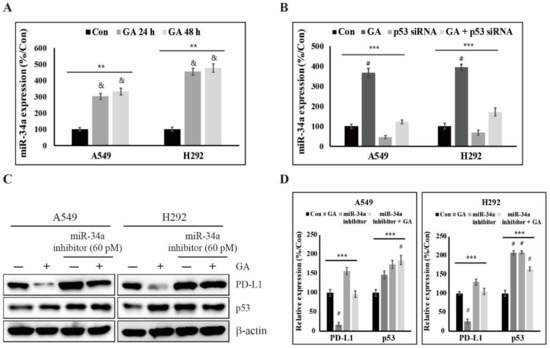 miRNAs, a family of small noncoding RNAs, regulate wide biological processes including carcinogenesis, which severely is dysregulated in many cancer cells. Some miRNAs such as miR-513 and miR-570 directly target PD-L1 [46,47]. However, p53 indirectly regulates the expression levels of PD-L1 through inducing miR-34a in cancer cells [33]. Although many studies have shown results for the regulation of PD-L1 expression directly by miRNA, detailed studies of the actions brought on indirectly by p53 via drugs including natural compounds is poorly understood. To understand the expression level of miR-34a by GA, we performed a real time PCR experiment because miR-34a is a well-known molecule transcriptionally induced by p53. As shown in Figure 5A, we found that it was significantly increased in a time- and GA concentration-dependent manner in both A549 and H292 cells. To further investigate miR-34a regulation by GA via p53, we additionally used p53 siRNA. The expression levels of miR-34a were decreased by p53 siRNA, but their expression levels were slightly increased by additional GA (Figure 5B). These results clearly suggest that miR-34a expression is regulated by GA-dependent p53. Additionally, we used a miR-34a inhibitor with or without GA to determine a more detailed interrelation analysis in the regulation of PD-L1 expression. In this experiment, we demonstrated that the inhibition of miR-34a function by its inhibitor is induced into an increase of PD-L1 protein which reversed by GA, but not p53 (Figure 5C,D). These results support that the expression of PD-L1 is regulated via miR-34a-induction through GA-dependent p53 in A549 and H292 cells.