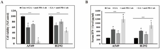 GA enhances the combination effect with anti-PD-1 mAb in an NSCLC-cell and peripheral blood mononuclear-cell (PBMC) coculture system. (A) The cell survival rates of NSCLC cells cocultured with PBMCs were examined after treatment with mock, GA (A549: 200 μM; H292: 50 μM), anti-PD-1 mAb (5 μg/mL), or both GA and anti-PD-1 mAb for 48 hours. *** p < 0.001 (ANOVA); # p < 0.001 vs. control. (B) The levels of interferon (IFN)-γ from the supernatants of the coculture system were measured by ELISA also following treatment with mock, GA (A549: 200 μM; H292: 50 μM), anti-PD-1 mAb (5 μg/mL), or both GA and anti-PD-1 mAb for 48 hours. *** p < 0.001 (ANOVA); # p < 0.001 vs. control.
