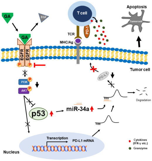 The tumor suppressor p53 is a transcription factor and plays a pivotal role in cell-cycle, DNA repair, senescence, and apoptosis [67,68,69]. Under various stresses such as DNA damage, p53 is phosphorylated and acetylated via posttranslational modification and then it is translocated to the nucleus for trans-activating numerous target genes that direct processes including cell-cycle arrest and/or apoptosis. Mutations of TP53 have been discovered in more than 50% of human cancers and p53 mutation leads to not only the loss of cancer suppressive functions but also the acquisition of additional oncogenic functions such as growth and survival [70]. Wild-type p53 proteins (WTp53) are frequently downregulated because of their function of tumor suppression in many cancer cells. Previous studies have identified that the downregulation of WTp53 is associated with EGFR signal-mediated PI3K/AKT pathway activation in cancer cells [65,66,71,72]. As mentioned above, we demonstrated that the downregulation of EGFR phosphorylation by GA leads to the inhibition of PI3K and AKT phosphorylation. The decrease in their phosphorylation by GA induced the upregulation of WTp53 protein and mRNA in A549 and H292 cells. Furthermore, the competitive activity of GA in an EGF-dependent condition suggested that binding of GA to EGFR, may associated with the upregulation of p53 through inhibiting EGFR/PI3K/AKT4 phosphorylation. These results also suggest that natural bioactive GA may have a potential role as a chemotherapeutic drug for NSCLC treatment. Although many studies have revealed that p53 is related to some immune responses including IFN signaling [73,74], the expression of inflammatory cytokines and Toll-like receptors [75,76,77], and the activation of T- and natural killer cells [78], the correlation of p53 and tumor immune evasion is poorly understood. Recently, some studies reported that p53 interacts with the apoptotic pathway by regulating miRNAs in cancer cells [79,80]. Furthermore, the effect on p53 was augmented in miR-34a expression, which leads to decreased expression levels of PD-L1 in NSCLC cells [33]. Interestingly, we found that bioactive GA decreased the protein and mRNA levels of PD-L1 as compared with the control experiment, and the expression levels of p53 and miR-34a were upregulated by GA in NSCLC cells. These results propose that GA controls the expression of PD-L1 by regulating the p53–miR-34a pathway.