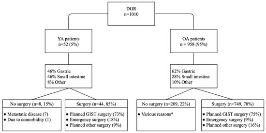 Study flowchart. * various reasons, such as metastatic disease, significant comorbidity, irresectable tumours or patients’ preference. DGR = Dutch GIST Registry; YA = young adult; OA = older adult.