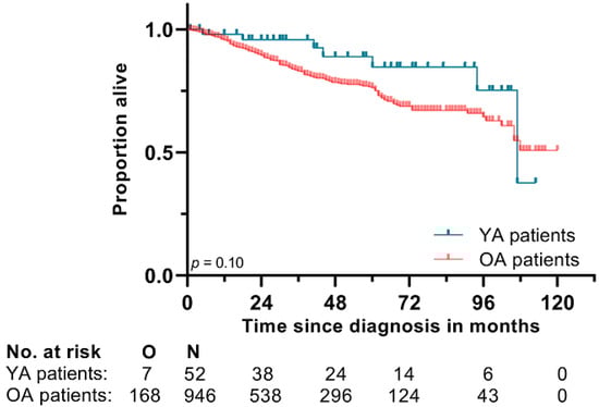 The median follow-up time in older adults (OA) was 37 months (95% CI: 33.0–41.0). The median OS time was not reached, but the estimated five-year survival rate was 76% (95% CI: 72.2–79.7). There was no significant difference in OS between the YA and OA patients (p = 0.10) (Figure 2).