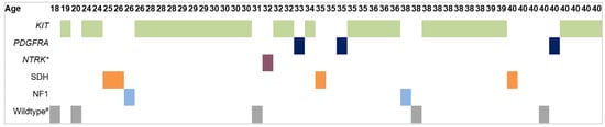 Regarding mutational status, adult GISTs are commonly driven by activating mutations in either the KIT proto-oncogene (75%) or the PDGFRA (platelet-derived growth factor receptor A) oncogene (15%) [1,12,13], and 10% were formerly named wildtype (WT) for KIT and PDGFRA [14]. However, genetic research has unveiled other sporadic genetic alterations leading to GISTs, including RAS pathway gene mutations and mutations in the four succinate dehydrogenase (SDH) subunits [15,16,17]. Therefore, the description WT GIST is disappearing, and it is now common practice for oncologists to describe which genetic alterations patients have been tested for [18]. In contrast to the molecular characteristics of adults with GIST, children are KIT and PDGFRA WT in the vast majority (85–90%) [7,19,20,21,22]. Finally, metastases in adults are mostly located intra-abdominally [1,23], whereas, in children, lymph node and lung metastases are more common [24].
