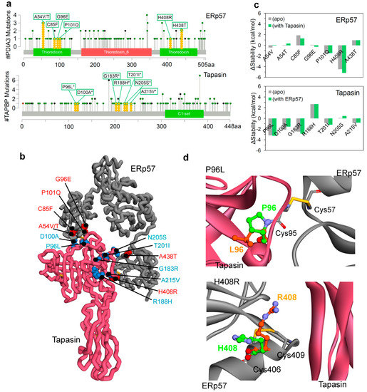 A number of cancer-associated mutations were found in the coding region of PDIA3 and TAPBP genes from the cBioPortal database (the cancer genomics data; Figure 2a and Figure S1) [34]. However, 14 different variants (Figure 2a,b) from the cancer genome atlas (TCGA) sequencing data that reside at the protein–protein or interacting interfaces might have a significant influence on the ERp57-tapasin complex, and therefore, were considered in this work. The findings from in silico mutagenesis analysis identified that H408R mutation in ERp57 improved its structural stability (−5 kcal/mol), and in the case of the tapasin protein mutations P96L, D100A, and G183R improved stability with ΔΔG (Δstability change) values of approximately −3, −2, and −3 (kcal/mol), respectively. In addition, the structural location of each variant suggests that the mutant H408R of ERp57 is placed in the vicinity of the intramolecular disulphide bond (Cys405-Cys409), and the mutant P96L of tapasin is located in the region of the intermolecular disulphide bond between ERp57-tapasin (Cys57-Cys95). The mutant H408R come from the active-site motifs (Cys-Gly-His-Cys) of the a and a’ domains in ERp57, catalytically active motif in a domain is Cys57-Gly58-His59-Cys60 and in a’ domain is Cys406-Gly407-His408-Cys409 [22,36]. Therefore, considering findings from the initial mutation screen and their importance in the active site cleft; mutants H408R(ERp57) and P96L(tapasin) close to the disulphide bonds (functional unit responsible for peptide editing [5,27,28]) were further investigated by molecular dynamics simulations (Figure 2c,d) in order to trace change in the intermolecular (ERp57-tapasin) interactions and dynamics of proteins upon mutation.