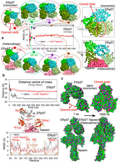 Structural analysis of the wild-type ERp57 from molecular dynamics (MD) simulations. (a) Root-mean-square deviation (RMSD) of all-atoms (excluding hydrogen atoms) of ERp57 in apo state and complexed with tapasin. Domain motion modes of ERp57 structure at different time intervals represented the dominant motions of a and a’ domains in the opened and closed conformation/state. (b) Distances between the centre of masses of the a and a’ domains of ERp57 and the residual fluctuations (RMSF; root-mean-square fluctuation) of each residue. (c) Structure conformations showing the switch of apo ERp57 from open to closed state, and ERp57 in complex with tapasin in its native conformation throughout the 1000 ns MD simulations (colour scheme: green colour for the hydrophobic regions, blue for mildly polar regions (e.g., the hydrogens of benzene) and purple for the hydrogen bonding regions).