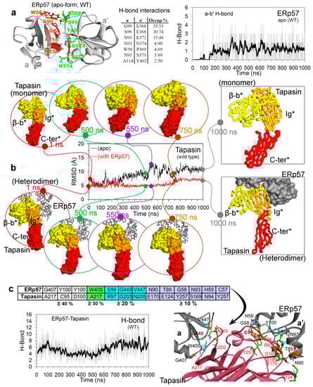 Closed conformation of ERp57 (apo state) and H-bond interaction between ERp57-tapasin. (a) Hydrogen bond interactions between the a and a’ domain of wild-type ERp57 in apo state, residues forming interactions with occupancy ≥ 1% are highlighted. Colour scheme: oxygen in red, hydrogen in silver, nitrogen in blue, and sulphur in orange. (b) RMSD of all-atoms (excluding hydrogen atoms) of tapasin in apo state and complexed with ERp57. Domain motion modes of tapasin structure at different time intervals are also presented. (c) Intermolecular H-bond interactions of ERp57 with tapasin over 1000 ns of MD simulations. In the diagram, interacting pairs of residues are coloured according to their H-bond occupancy over 1000 ns.
