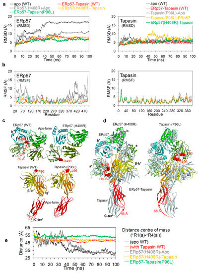 Structural analysis of mutant ERp57(H408R) and tapasin(P96L) systems in comparison with the wild-type systems. (a) RMSD of all-atoms (excluding hydrogen atoms) of ERp57 and tapasin from wild-type and mutant systems. (b) The residual fluctuations (RMSF) of each residue of ERp57 and tapasin in simulated wild-type and mutant systems. (c and d) Structure conformations or domain motions of ERp57 and tapasin structures in different simulated systems. (e) Distance of mass centre between a and a’ domains in ERp57 structure plotted as a function of time.
