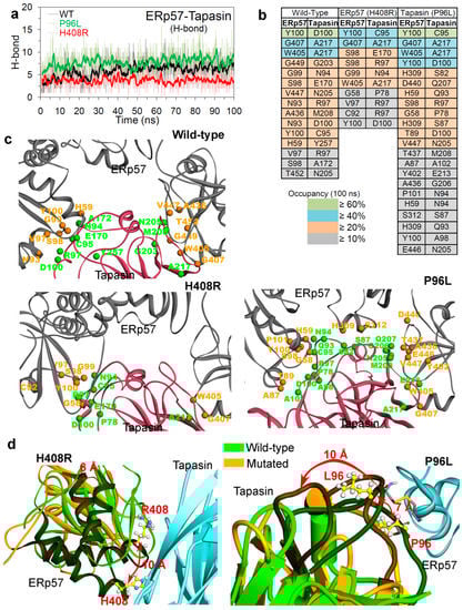 Intermolecular hydrogen bonds formed in the ERp57-tapasin complexes. (a) Number of H-bonds formed between ERp57 and tapasin over 100 ns of MD simulations. (b and c) Functional residues of ERp57-tapasin involved in H-bond formation. In the diagram, interacting pairs of residues are coloured according to their H-bond occupancy over 100 ns of MD simulation. (d) Inward conformation change of mutation H408R (reduces ERp57-tapasin interactions) and outward conformation of P96L mutant (increases ERp57-tapasin interactions). Colour scheme: carbon in yellow, oxygen in red, hydrogen in silver, nitrogen in blue, and sulphur in orange.
