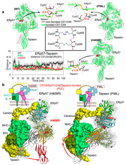 In vivo evidences suggest that covalent ERp57-tapasin heterodimer is the functional unit responsible for the peptide editing [5,27,28], and is 50–85% covalently bonded in cells activated with interferon-γ [23,24,25,26]. Therefore, to understand the dynamics of the disulphide bond between Cys57(ERp57)-Cys95(tapasin) on the ERp57-tapasin complex, systems were also simulated in the absence of a disulphide bond between two cysteines (Cys57 and Cys95; Figure 7a). Coordinates of ERp57-tapasin extracted from MD were superimposed with each other, and it was observed that for ERp57 overall there was a similar trend of conformational changes in both forms (bonded/non-bonded) for the wild-type, P96L and H408R systems (Figure 7a). However, the C-terminal domain of tapasin in the wild-type system has slightly more movement in the non-bonded form compared to the bonded form. In addition, for the P96L mutant system in both forms, the ERp57 and tapasin had almost similar conformational change, except for some residues (ranging 305–317) in ERp57 have shown movements towards the tapasin protein in the bonded form (Figure 7a). Moreover, analysing the distance between SH (sulphur) atoms of two Cys57(ERp57) and Cys95(tapasin) in non-bonded forms, it was observed that the wild-type system has more distance compared to the other two (P96L and H408R) mutant systems (Figure 7a).