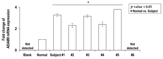 The plasma levels of ADAM9 mRNA were tested in the five newly diagnosed and treatment-naïve HCC patients (Table 1, Subject #1 to #5) and expressed as fold changes compared to the healthy control group (n = 5, 100% female, mean age 34.2 years). The mean value of pre-treatment plasma ADAM9 mRNA levels in the HCC patients was significantly higher than that in the healthy controls (3.001 ± 0.279 vs. 1.00 ± 0.005, p < 0.05) (Figure 1).