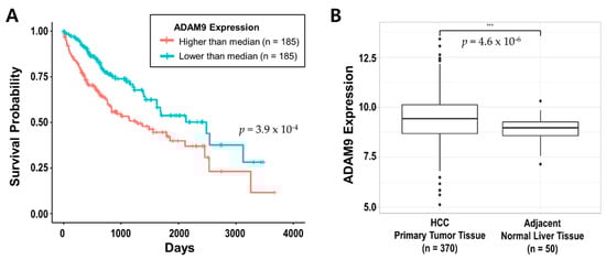 Effect of ADAM9 expression on HCC prognosis in the TCGA database. (A) Kaplan–Meier plot of HCC patients (n = 370) according to ADAM9 expressions level higher or lower than median (n = 185 for each group). (B) Box-plot comparing ADAM9 expression between HCC primary tumor (n = 370) and adjacent normal liver tissue (n = 50). Abbreviations: HCC, hepatocellular carcinoma; TCGA, The Cancer Genome Atlas.