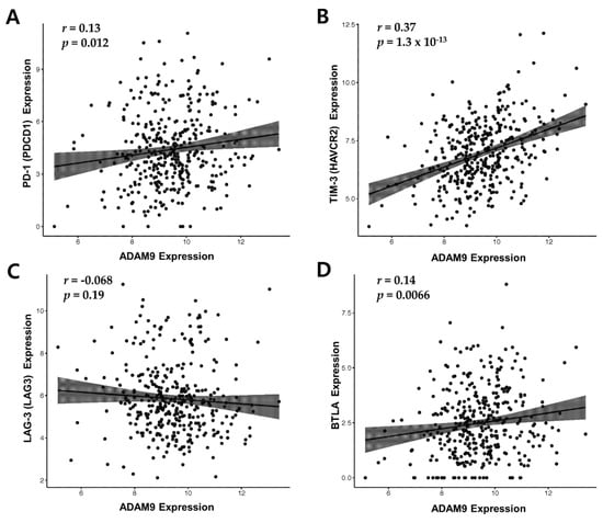 The correlation between ADAM9 expression and expression of immune checkpoint molecules (PD-1, TIM-3, lymphocyte activation gene-3 (LAG-3) and B and T lymphocyte attenuator (BTLA)) in HCC patients (n = 370) from TCGA database was analyzed. ADAM9 expression was positively correlated with the expression of PD-1, TIM-3, and BTLA but not with that of LAG-3 (Figure 4). TIM-3 had the strongest positive correlation with ADAM9 (Correlation coefficient r = 0.37 and p = 1.3 × 10−13) (Figure 4B).