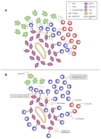 - Platten, M.; Ochs, K.; Lemke, D.; Opitz, C.; Wick, W. Microenvironmental clues for glioma immunotherapy. Curr. Neurol. Neurosci. Rep. 2014, 14, 440. [Google Scholar] [CrossRef]