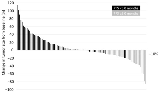 All patients had one or more measurable lesions based on the RECIST criteria. Figure 1 shows a waterfall plot of the ETS. The median change in ETS was +1.0%, with a range of −85% to +114%. Of the 104 patients, 54 (51.9%) and 50 (48.1%) were classified in the long-term (PFS ≥ 5.0 months) and short-term (PFS < 5.0 months) responders, respectively.