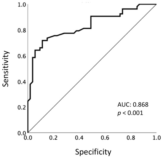 Figure 2 shows the results of the receiver operating characteristic (ROC) analysis performed to determine the ability of ETS to predict PFS (<5.0 vs. ≥5.0 months). The area under the ROC curve was 0.868, and the optimal cut-off value of ETS was identified as 10%, which yielded a sensitivity of 80.0% and specificity of 74.1%. Additionally, when ETS ≥ 30% (i.e., the cut-off value for objective response) was used, the specificity was considerably worse, at 20.4%, although the sensitivity increased to 98.0%.