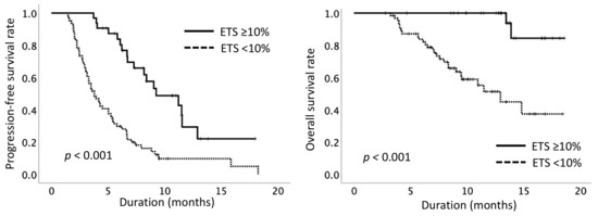 Patients with ETS ≥ 10% had a longer PFS than that of patients with ETS < 10% (median 9.3 vs. 3.3 months, p < 0.001) (Figure 3).
