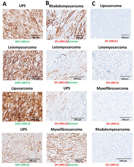 LRRC15 staining obtained by immunohistochemistry for different histological subtypes of soft-tissue sarcomas (STS) with different level of expression in cancer cells and stroma. (A) Examples of STS with a significant expression in cancer cells. (B) Examples of STS without expression of LRRC15 in cancer cells but with an expression in the surrounding stroma. Staining was predominantly seen in spindle cells (fibroblasts) and in the extracellular matrix. (C) Examples of STS without expression of LRRC15.
