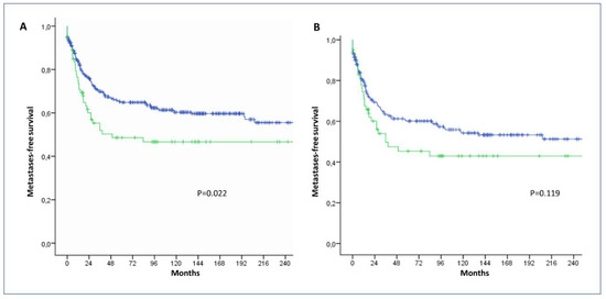 Kaplan-Meier curves of metastases-free survival according LRRC15 expression. (A) Kaplan–Meier curves of metastases-free survival according to LRRC15 expression score in a cohort of 425 patients with soft-tissue sarcoma (green line: LRRC15 H score > 160, blue line: LRRC15 H score ≤ 160). (B) Kaplan–Meier curves of metastases-free survival according to LRRC15 expression (green line: LRRC15 H score > 160, blue line: LRRC15 H score ≤ 160) in patients with grade 3 STS.