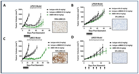 In vivo anti-tumor activity of ABBV-085 monotherapy in STS. (A,B) Tumor growth curves for liposarcoma models LPS15 (A: LRRC15 positive) and LPS28 (B: LRRC15 negative) treated with ABBV-085. (B) Tumor growth curves for leiomyosarcoma models LMS33 (C: LRRC15 cancer positive) and LMS20 (D: LRRC15 negative) treated with ABBV-085. A total of 7–9 mice/group of treatment. For each model, a figure indicating the level LRRC15 expression in the parental tumor from which the patient-derived xenograft (PDX) was derived is represented.