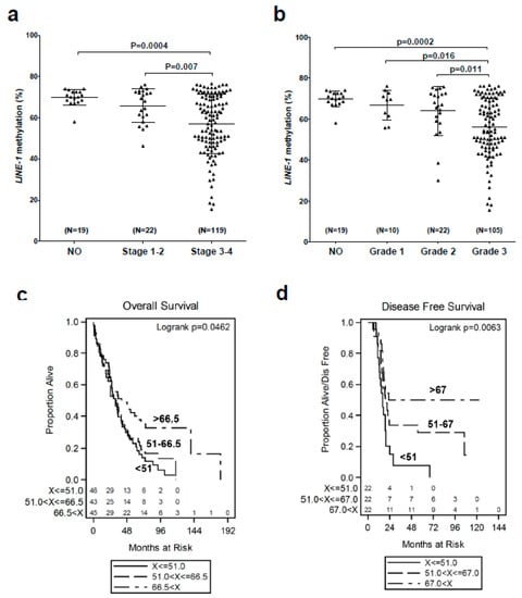 LINE-1 hypomethylation is associated with advanced disease and reduced survival in EOC. LINE-1 methylation was determined by sodium bisulfite pyrosequencing. (a) LINE-1 methylation vs. clinical stage. (b) LINE-1 methylation vs. pathological grade. For a and b, mean ± SD is plotted, and Mann–Whitney p-values are indicated. (c,d) Kaplan–Meier survival analyses and log rank test p-values of EOC patients separated based on tumor LINE-1 methylation values. (c) LINE-1 methylation vs. overall survival. Patients were separated into three groups based on LINE-1 methylation values: low (<51.0%), middle (51.0–66.5%), and high (>66.5%). A key for the three groups, and the number of patients in each, is shown. (d) LINE-1 methylation vs. disease-free survival. Patients were separated into three groups based on LINE-1 methylation values: low (<51.0%), middle (51.0–67.0%), and high (>67.0%). A key for the three groups, and the number of patients in each, is shown.