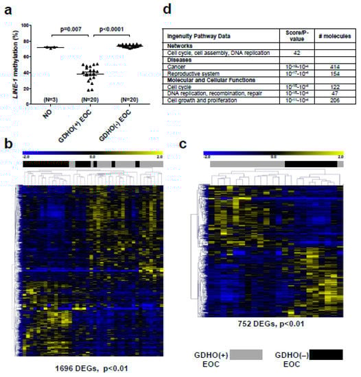 GDHO (+) EOC show distinct patterns of gene expression. (a) LINE-1 methylation in sample groups used for Affymetrix gene expression analyses: bulk normal ovary (NO), GDHO (+) EOC (i.e., LINE-1 hypomethylated group), GDHO (–) EOC (i.e., LINE-1 hypermethylated group). (b) Hierarchical clustering heat map of genes differentially expressed (p<0.01) between GDHO (+) vs. GDHO (–) EOC (all samples). (c) Hierarchical clustering heat map of genes differentially expressed between disease-matched (age-matched, stage 3/4, grade 3, serous EOC) GDHO (+) vs. GDHO (–) EOC. All tumors correspond to the HGSOC subtype. The number of genes showing significant differential expression in each comparison is indicated. Sample identities are indicated at top (see key). (d) Selected Ingenuity Pathway Analyses (IPA) data for the GDHO (+) vs. GDHO (–) EOC microarray comparison.