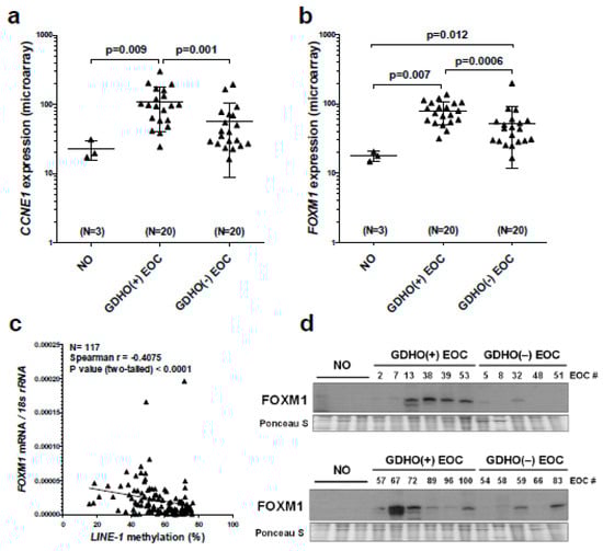 We used Ingenuity Pathway Analyses (IPA) of expression data to interrogate cellular pathways altered in GDHO (+) tumors. We observed significant alterations in both cancer and reproductive disease pathways (Figure 2d; Table S3). In addition, functional pathways related to cell cycle, DNA replication, cell growth, and cell proliferation were remarkably altered. Thus, we suspected that increased proliferation was a key characteristic of GDHO (+) EOC (Figure 2d; Table S3). To test this, we measured the expression of the canonical proliferation marker MKI67 [] in GDHO (+) vs. GDHO (–) EOC. Both microarray and RT-qPCR analysis demonstrated significantly elevated MKI67 expression in GDHO (+) EOC, as well as a significant negative association with LINE-1 methylation (Supplementary Figure S2). In addition, two key oncogene drivers of EOC proliferation, CCNE1 and FOXM1 [,], were markedly up-regulated in GDHO (+) EOC (Figure 3a,b). An association of CCNE1 amplification with DNA hypomethylation was previously reported in stomach cancer []. Based on the pervasive role of the FOXM1 pathway in EOC, and a report that FOXM1 is linked to changes in DNA methylation [,], we tested the association between FOXM1 expression and LINE-1 methylation in a larger set of EOC samples. Notably, we observed a strong inverse association between FOXM1 expression and LINE-1 methylation (Figure 3c). In addition to its mRNA, FOXM1 protein and several FOXM1 target genes, including PLK1, AURKB, BIRC5, and CCNB1 [], were significantly up-regulated in GDHO (+) EOC, consistent with functional activation of FOXM1 (Figure 3d; Figure S3). Furthermore, gene set enrichment analysis (GSEA) showed that there was significant enrichment of the FOXM1 transcription factor network (p < 0.01, FDR < 0.25) and G2/M checkpoint genes (p < 0.05, FDR < 0.25) in GDHO (+) EOC (data not shown). Together, these data implicate increased FOXM1 expression as a prominent feature of GDHO in EOC. We considered the possibility that increased expression of CCNE1 and/or FOXM1 in GDHO (+) EOC could result from direct hypomethylation of their promoters, i.e., correspond to a passenger effect in GDHO (+) EOC tumors. However, bisulfite sequencing analyses indicated that the CCNE1 and FOXM1 promoters were hypomethylated in NO, GDHO (–) and GDHO (+) EOC (Figure S4). Thus, CCNE1 and/or FOXM1 and, more generally, increased proliferation, might promote GDHO, rather than vice versa.