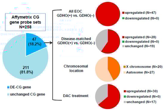 CG antigen genes are overexpressed in GDHO (+) EOC. A CG antigen gene list was obtained from the CT gene database []. Left: the proportion of CG genes (i.e., corresponding Affymetrix probes) differentially expressed between GDHO (+) and GDHO (–) EOC (p < 0.01) as determined by Affymetrix microarray. Right: Direction of expression change for the DEGs in all samples or disease-matched samples, their chromosomal localization, and the effect of decitabine (DAC) treatment on their expression in cell lines, as determined by Affymetrix microarray. See Methods for cell lines and treatment details.