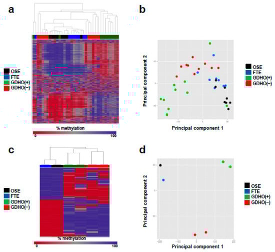 To better understand the DNA methylation landscape in GDHO (+) EOC, we initially used Illumina Infinium 450K arrays (450K) []. In addition to profiling both groups of EOC, we analyzed normal epithelia (NE; OSE + FTE average) as a control. Unsupervised hierarchical clustering and principal component analyses (PCA) of 450K data revealed that GDHO (+) and GDHO (–) EOC have distinct DNA methylomes, and, in addition that each are distinct from NE (Figure 5a,b). To define the methylome in greater depth, we next performed methylome sequencing (Methyl-seq) using a solution hybridization selection method []. 450K and Methyl-seq data were highly concordant (Pearson r = 0.97; N = 347,357 CpG sites), and hierarchical clustering and PCA analyses of Methyl-seq confirmed that GDHO (+) EOC, GDHO (–) EOC, and NE have distinct methylomes (Figure 5c,d). Compared to NE, DNA methylation was reduced in GDHO (+) but not GDHO (–) EOC (Figure 5e,f). 450K and Methyl-seq showed that a large number of promoters were differentially methylated in the two EOC groups, with most, regardless of CpG island context, showing hypomethylation in GDHO (+) EOC (Figure S6). In contrast, promoter hypermethylation and hypomethylation were similar in EOC vs. NE, with CpG island promoters mostly hypermethylated and non-CpG island promoters mostly hypomethylated in EOC (Figure S6). We defined differentially methylated regions (DMR) globally and found that the vast majority of DMR were hypomethylated in GDHO (+) vs. GDHO (−) EOC (Figure S7). The majority of DMR were also hypomethylated in EOC compared to NE (Figure S7). As methylation at different genomic locations has distinct consequences, we calculated differentially methylated CpG sites (DMC) independently for genes, CpG islands, CpG shores, CpG shelves, and CpG open seas, as described previously []. Most DMC were hypomethylated in GDHO (+) compared to GDHO (–) EOC, regardless of genomic context (Figure S7c,d), while hypermethylation and hypomethylation was more evenly split for EOC vs. NE (Figure S7e,f). In the latter comparison, CpG rich regions of the genome favored hypermethylation in EOC, while CpG poor regions (i.e., open seas) favored hypomethylation in EOC.