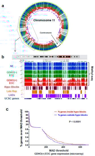 A passive model for GDHO predicts that DNA hypomethylation should be concentrated at the genomic regions that are the most difficult to methylate, e.g., heterochromatic and late replicating regions, including LADs; and this is precisely what we and others have observed [,,,,,]. The association of GDHO with LADs should be viewed with caution, however, as, to our knowledge, LADs have not been simultaneously mapped with DNA methylation in parallel. In this context, one report observed a link between DNA hypomethylation and late replication timing, and showed that the association of each of these sequences with LADs was secondary [].
