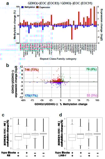 Based on prior knowledge [], we investigated the relationship between GDHO and RE expression. We used total RNA-seq and Methyl-seq, methods that allow precise genomic mapping of repeat sequences. RE expression was mostly elevated in GDHO (+) EOC (Figure 8a,b). However, this effect was not uniform, but rather was class-specific (Figure 8a; Table S11). Most of the up-regulated RE in GDHO (+) EOC were hypomethylated at their corresponding genomic loci (Figure 8a,b). We additionally examined the relationship between RE methylation and hypomethylated blocks. RE showed specific patterns of enrichment or depletion in hypomethylated blocks, including LINE-1, which in most instances, was enriched in hypomethylated blocks. In contrast, Alu/SINE and satellite sequences were depleted from hypomethylated blocks (Table 1; Table S12). Methyl-seq data indicated that as reported previously for colon cancer [], hypomethylation in EOC was mostly a consequence of hypomethylated block formation, rather than RE or LINE-1 hypomethylation per se (Figure 8c,d).
