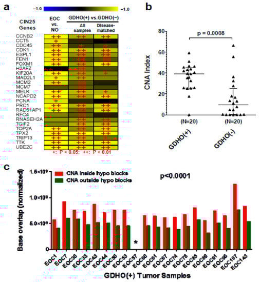 GDHO (+) EOC tumors show increased CIN, and CNA are enriched within hypomethylated blocks. (a) Expression of CIN25 signature genes in the indicated sample comparisons. Gene expression was determined by Affymetrix microarrays, and log2 fold change values are shown. + p < 0.05, ++ p < 0.01. (b) CNA index in GDHO (+) EOC vs. GDHO (–) EOC. EOC samples are disease-matched and represent HGSOC. CNA were determined using Affymetrix Cytoscan HD chips as described in Methods. Median with interquartile range is plotted, and the Mann–Whitney p-value is shown. (c) CNA are enriched in hypomethylated blocks. The total base pair overlap between CNA and hypomethylated blocks, or outside hypomethylated blocks, in GDHO (+) EOC. Hypomethylated blocks were determined by Methyl-seq analysis of GDHO (+) EOC vs. normal epithelia (NE; OSE + FTE average), and CNA were determined as described in panel b. Hypomethylated block and non-hypomethylated block regions were normalized according to the percent genomic coverage of each. The two-way ANOVA p-value is shown. The asterisk indicates that the values are too low to be visible on the scale.
