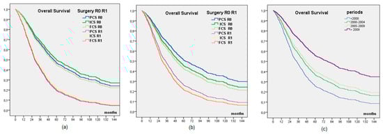 Among patients with complete cytoreduction, after adjusting for the prognostic factors (Figure 1, Table 4), OS was no different for PCS, ICS, or FCS surgeries, but we observed a significant difference between FCS and PCS in an adjusted model on periods (HR = 1.278, CI 95% 1.027–1.590, p = 0.028), with a significant increase in OS from P1 to P4. PFS was significantly shorter for FCS (OR = 0.669, CI 95% 0.486–0.921, p = 0.014).