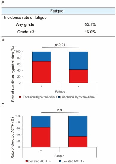 Analysis of lenvatinib-induced fatigue. (A) Incidence rate. (B) Correlation between fatigue and thyroid function (fatigue was significantly correlated with subclinical hypothyroidism). (C) Association between fatigue and adrenal function (fatigue was not significantly correlated with elevated acetylthiocholine iodide (ACTH)). n.s.: not significant.