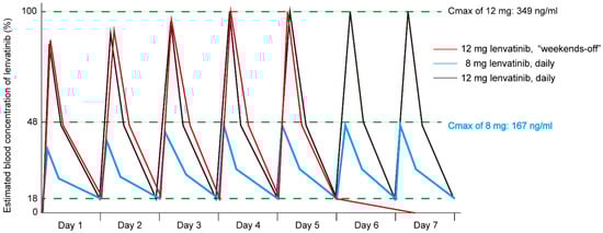 We simulated the blood concentration in the weekends-off protocol using the values reported by Ikeda et al. []. They reported that 12 mg and 8 mg of lenvatinib resulted in a Cmax of 349 and 167 ng/mL, respectively, and an AUC of 3960 and 1770 ng/mL/h, respectively. The blood concentration 24 hours after administration (C24h) of 12 mg and 8 mg of lenvatinib was 64.0 and 24.9 ng/mL, respectively. The time to the peak steady state drug concentration (Tmax) after administering 12 mg and 8 mg of lenvatinib was 2 and 2.03 hours, respectively. The terminal elimination phase half-life of 12 mg and 8 mg of lenvatinib was 9.74 and 10.2 hours, respectively. We simulated the drug blood concentration for the weekends-off administration of lenvatinib using these numerical values.