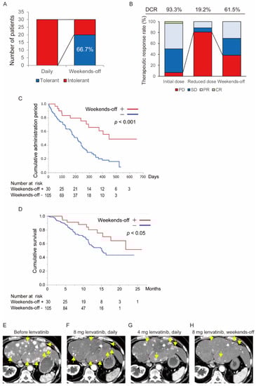 Among the 135 patients treated with lenvatinib, 30 patients were treated using the weekends-off strategy. An overall flowchart of the 135 patients treated with lenvatinib in this study is shown in Figure S6. Of the 135 patients, 20 patients (14.8%) received the initial dose of lenvatinib without any dose reduction, while the other 115 patients (85.2%) needed a dose reduction. Of the 115 patients, 28 patients received the first reduced dose and 57 patients received the second reduced dose. The weekends-off protocol of lenvatinib was administered to 30 patients. The patient and tumor characteristics are shown in Table S3. Fatigue was the most common cause of dose reduction (Table S4). With respect to tolerability toward AEs, 66.7% of patients treated using the weekends-off strategy were able to continue without developing intolerable AEs (Figure 4A). With respect to a therapeutic response, 80.8% of patients showed progressive disease after dose reduction of lenvatinib, which meant only the reduced dose administration of lenvatinib effected 19.2% of patients in total. However, 61.5% of patients who switched to the weekends-off protocol using the original dose recovered the therapeutic response (Figure 4B). These results suggested that a fixed proportion of patients whose lenvatinib dose was reduced due to the appearance of AEs is salvaged by weekends-off administration with respect to a therapeutic response and tolerability toward AEs. According to these results, the median administration period of lenvatinib in the patients who administered a weekends-off protocol (438 days) was significantly longer than that in the patients who could not administer a weekends-off protocol (213 days) (p < 0.001, Figure 4C). Additionally, we analyzed the overall survival (OS) in both groups (Figure 4D). The median survival time (MST) of patients who received the standard (continuous daily administration) protocol was 15.2 months, while >50% of the patients who received the weekends-off protocol of lenvatinib survived for at least 20 months, and their follow-up is continuing. Administration of the weekends-off protocol significantly contributed to prolonging survival in the patients with HCC who received lenvatinib treatment (p < 0.05). Additionally, we also compared the OS between patients who were placed on the “weekends-off” protocol and patients who did not need any dose reduction of lenvatinib. There was no significant difference between the two groups, and this confirms the effectiveness of the “weekends-off” protocol of lenvatinib (Figure S7). A representative case treated by the weekends-off protocol is shown in Figure 4E–H. This patient had multiple recurrent nodules in the liver after hepatic resection, hepatic arterial infusion chemotherapy, transcatheter arterial chemoembolization, sorafenib, and regorafenib. The initial lenvatinib dose was 8 mg once daily (Figure 4E). One month after the start of treatment, the patient was determined to have achieved partial response (PR) based on the findings of impaired enhancement of most lesions on the computed tomography (CT) (Figure 4F). However, the patient developed Grade 3 fatigue. Therefore, the dose was reduced to 4 mg daily after a temporary interruption. The fatigue was manageable, but enhanced CT showed multiple re-enhanced nodules (Figure 4G). Then, treatment was switched to the weekends-off at the original dose of 8 mg of lenvatinib. The re-enhancement disappeared again with manageable AEs (Figure 4H). In this patient, long-term lenvatinib at more than 18 months was administered under control of tumor progression.