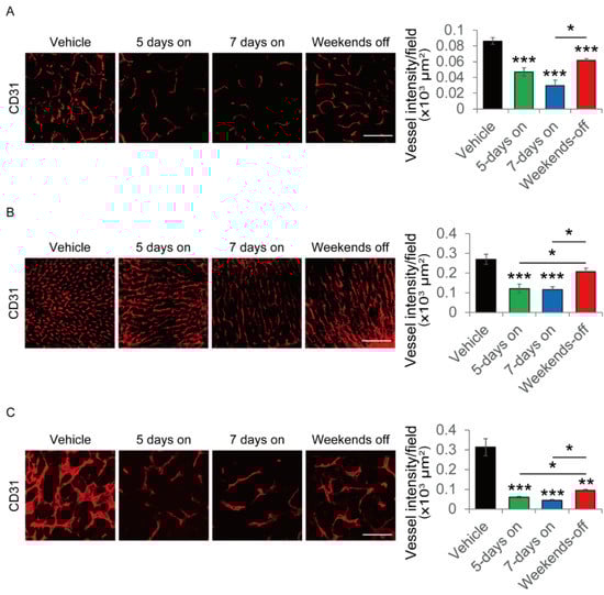 Clinically, the weekends-off method of lenvatinib was useful. To evaluate changes in vascular structure under weekends-off administration of lenvatinib, we assessed the vascular structure of both the tumor and the organs in vehicle treatment, lenvatinib 5 days-on (The mice were sacrificed on day 5), lenvatinib 7 days-on (The mice were sacrificed on day 7), and lenvatinib 5 days-on/2 days-off (weekends-off/The mice were sacrificed on day 7) groups. The weekends-off group showed significant recovery of the vascular structure in the thyroid and adrenal glands comparing with a 5 days-on and a 7 days-on group (Figure 5A,B). However, the weekends-off group also showed revascularization in the tumor (Figure 5C). These results showed that the vasculatures of not only the tumor but also of the organs dynamically fluctuated from the administration and temporary withdrawal of lenvatinib.